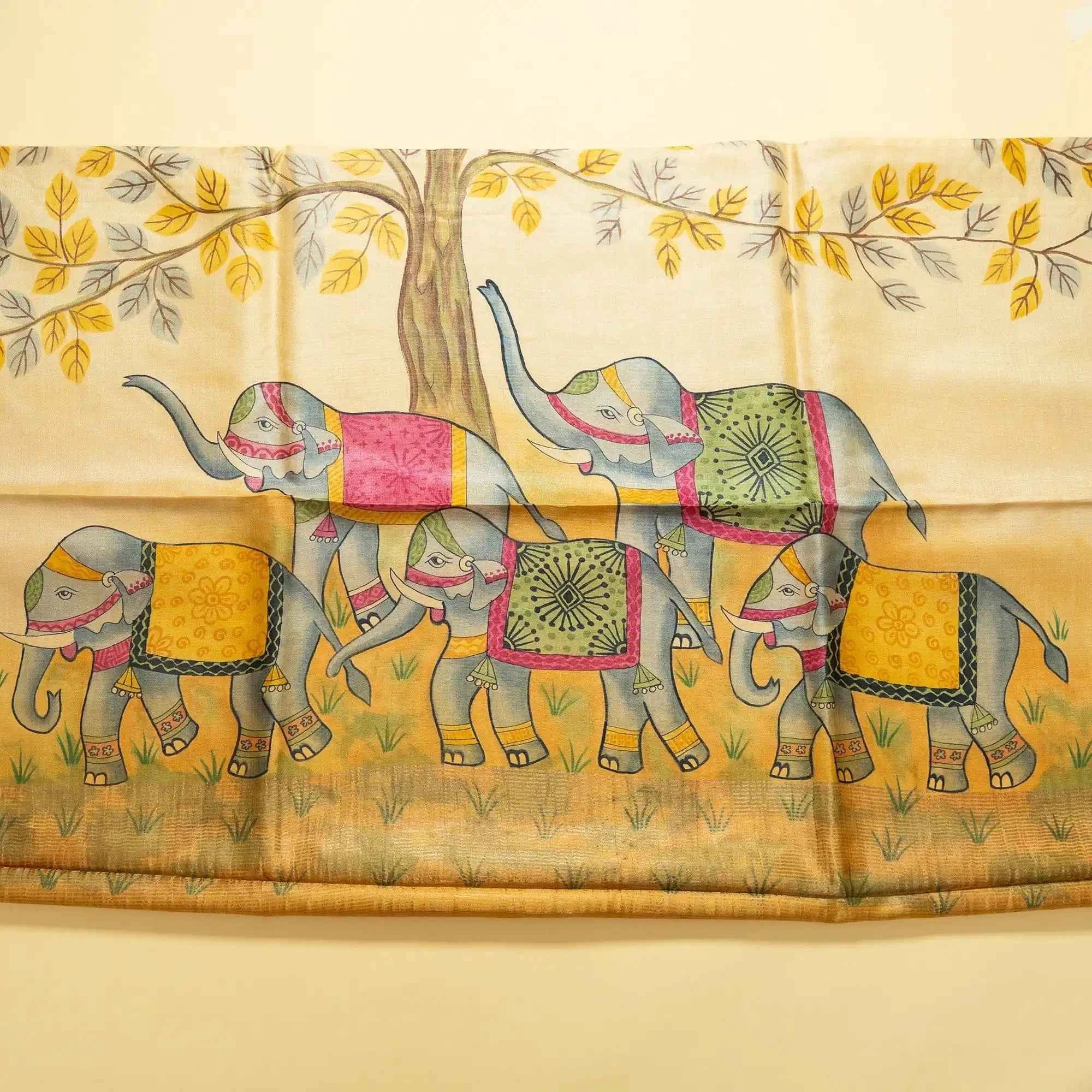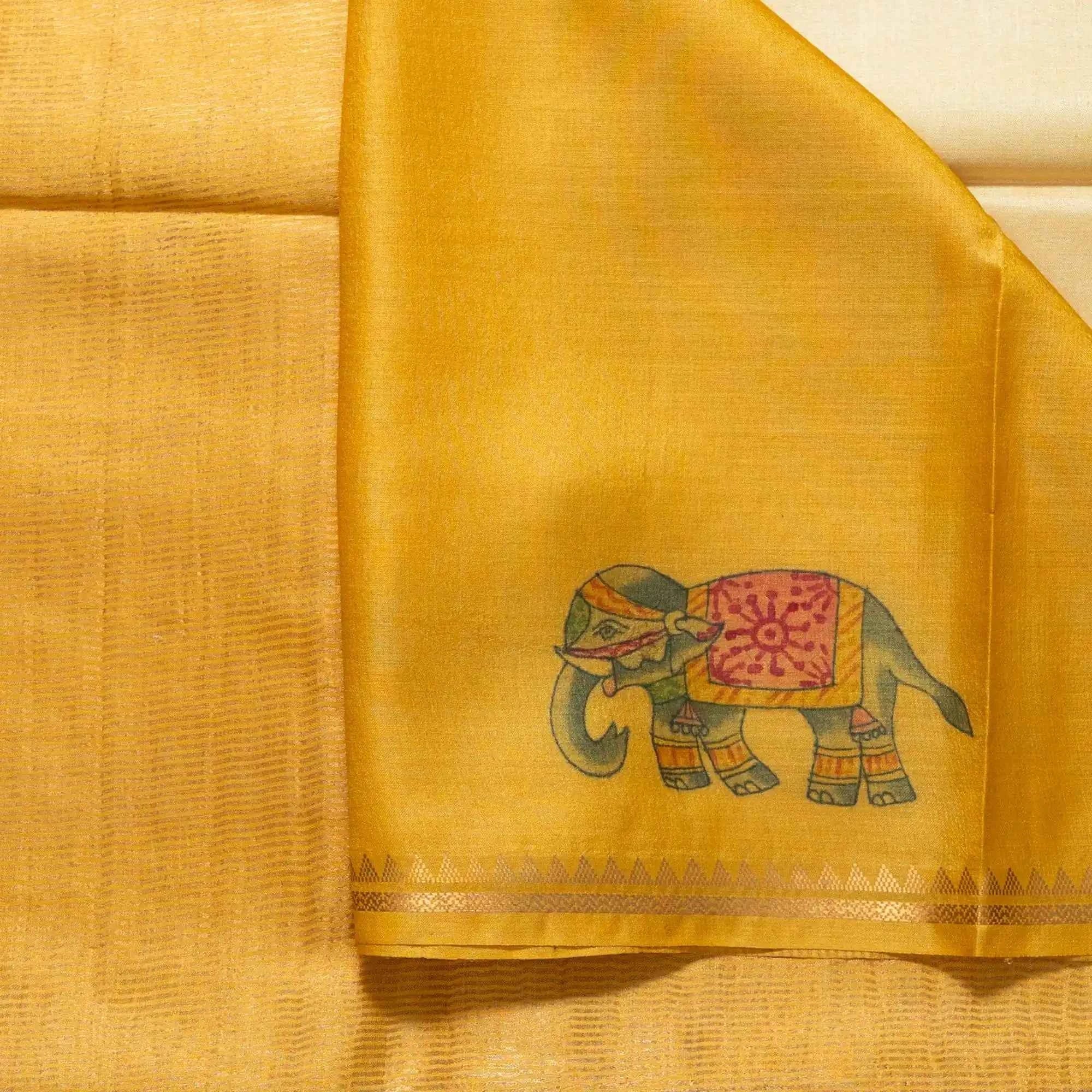 Hand painted Yellow Pure Kosa Silk Elephant Theme Saree (Silk Mark Certified)