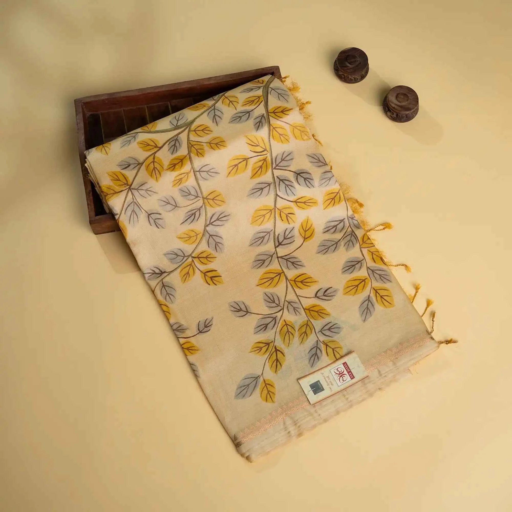 The saree features an all-over handpainted leaf motif in shades of yellow and grey, creating a refreshing design across the body. The pattern gives it a nature-inspired touch while maintaining a neat and uncluttered look. A minimal border complements the overall aesthetic without overpowering the design.