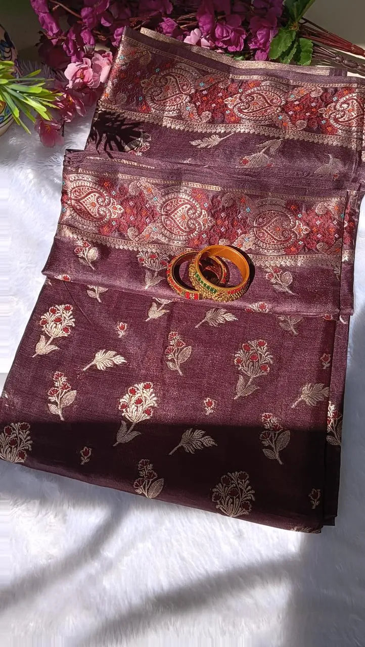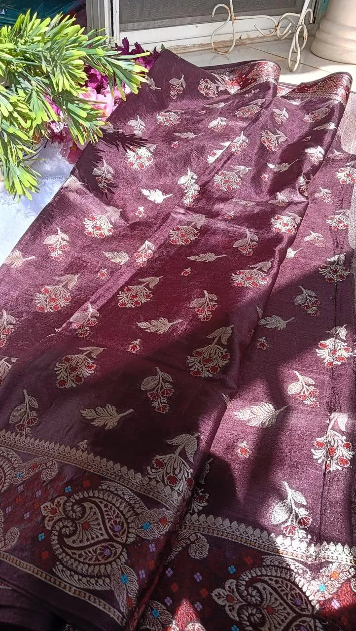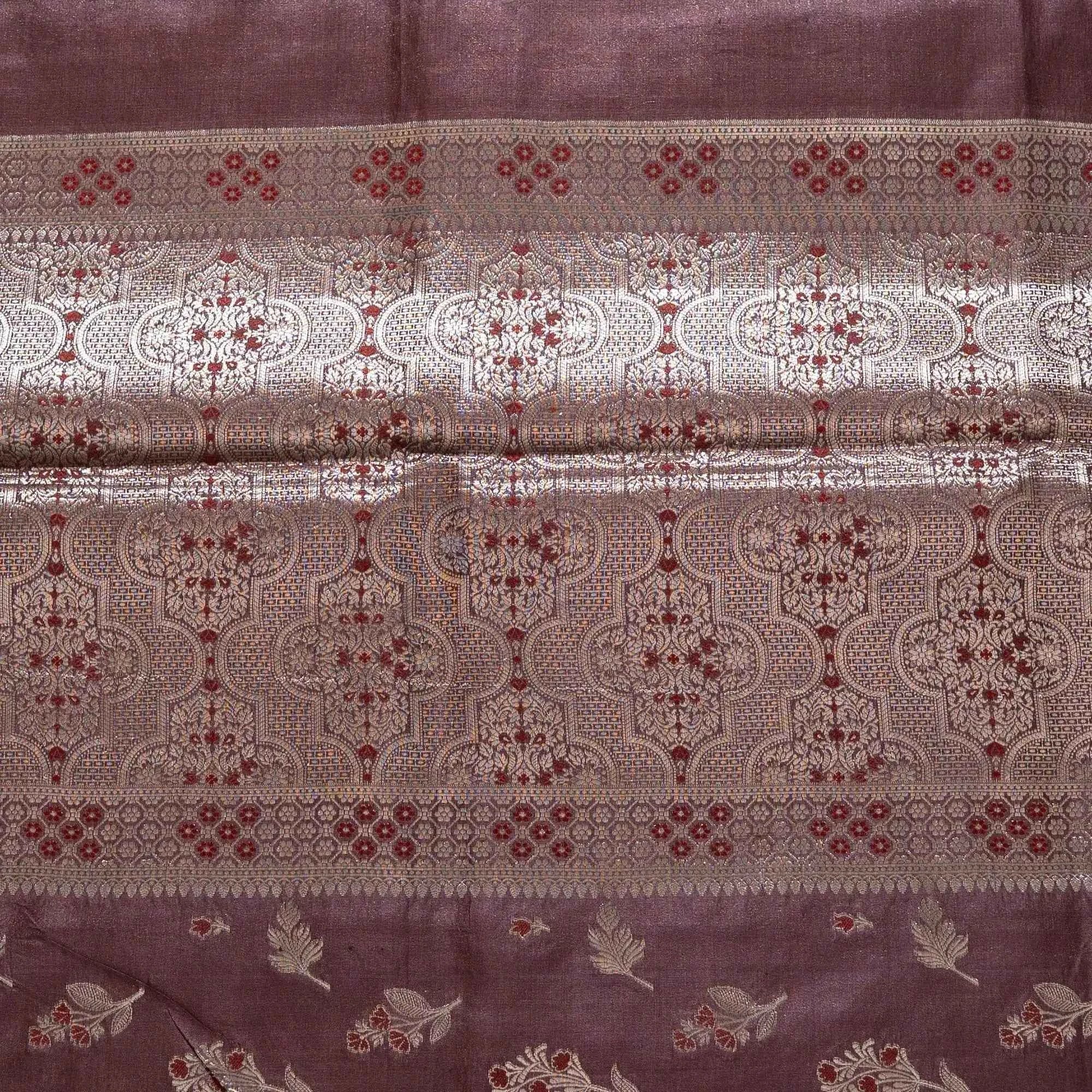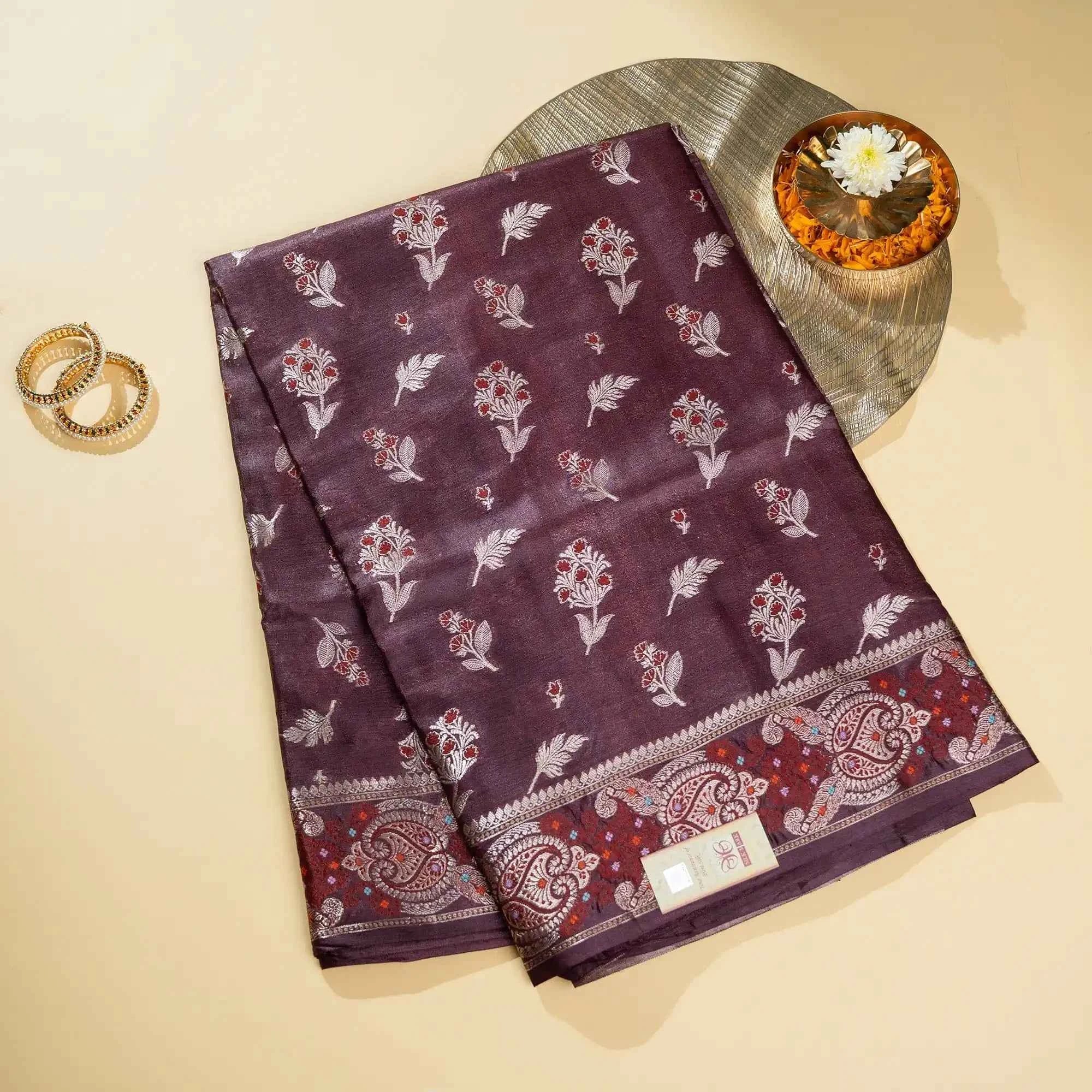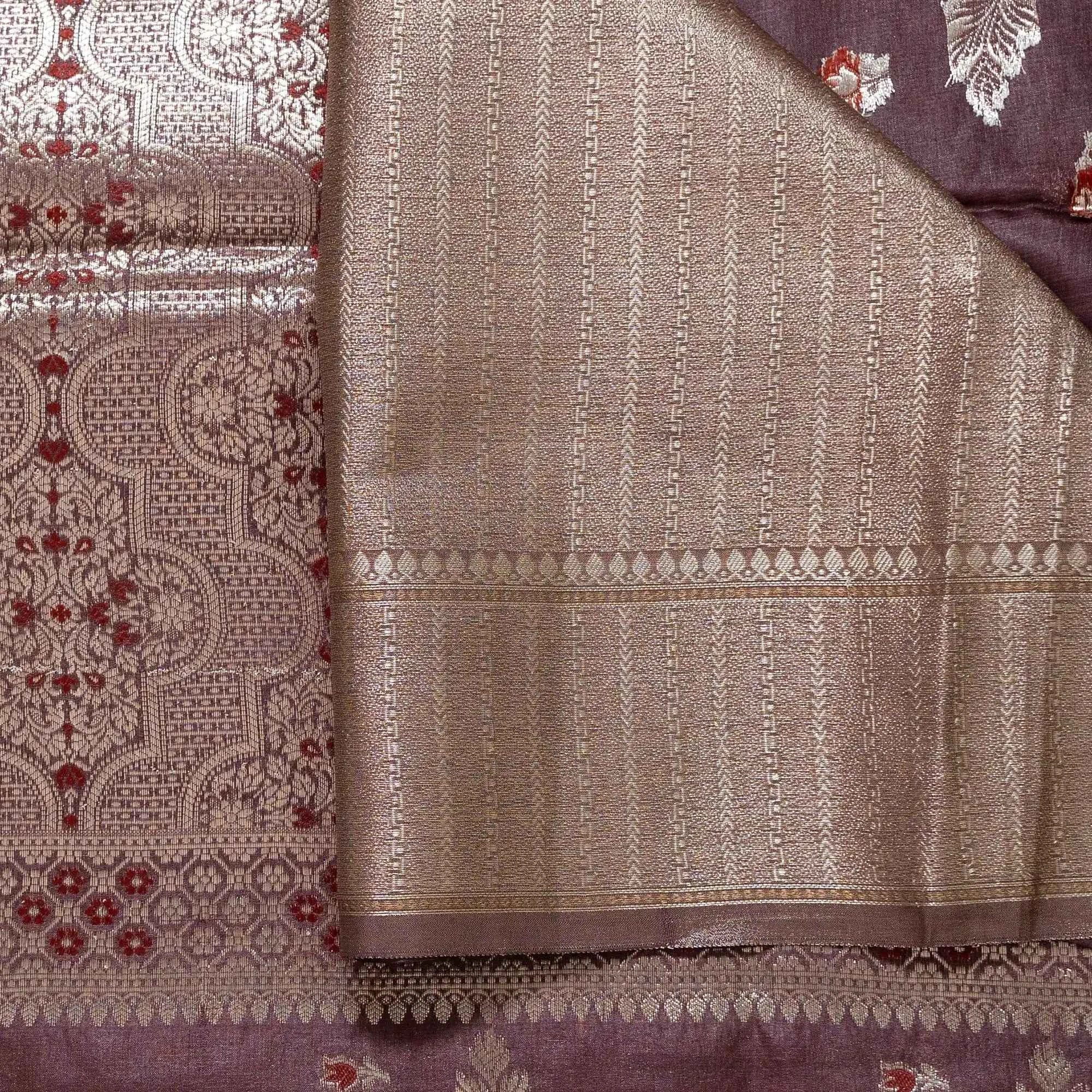 Subtle floral motifs arranged across the body give this saree a calm and composed look. The design feels balanced and slightly vintage in character, making it suitable for both festive wear and traditional gatherings.