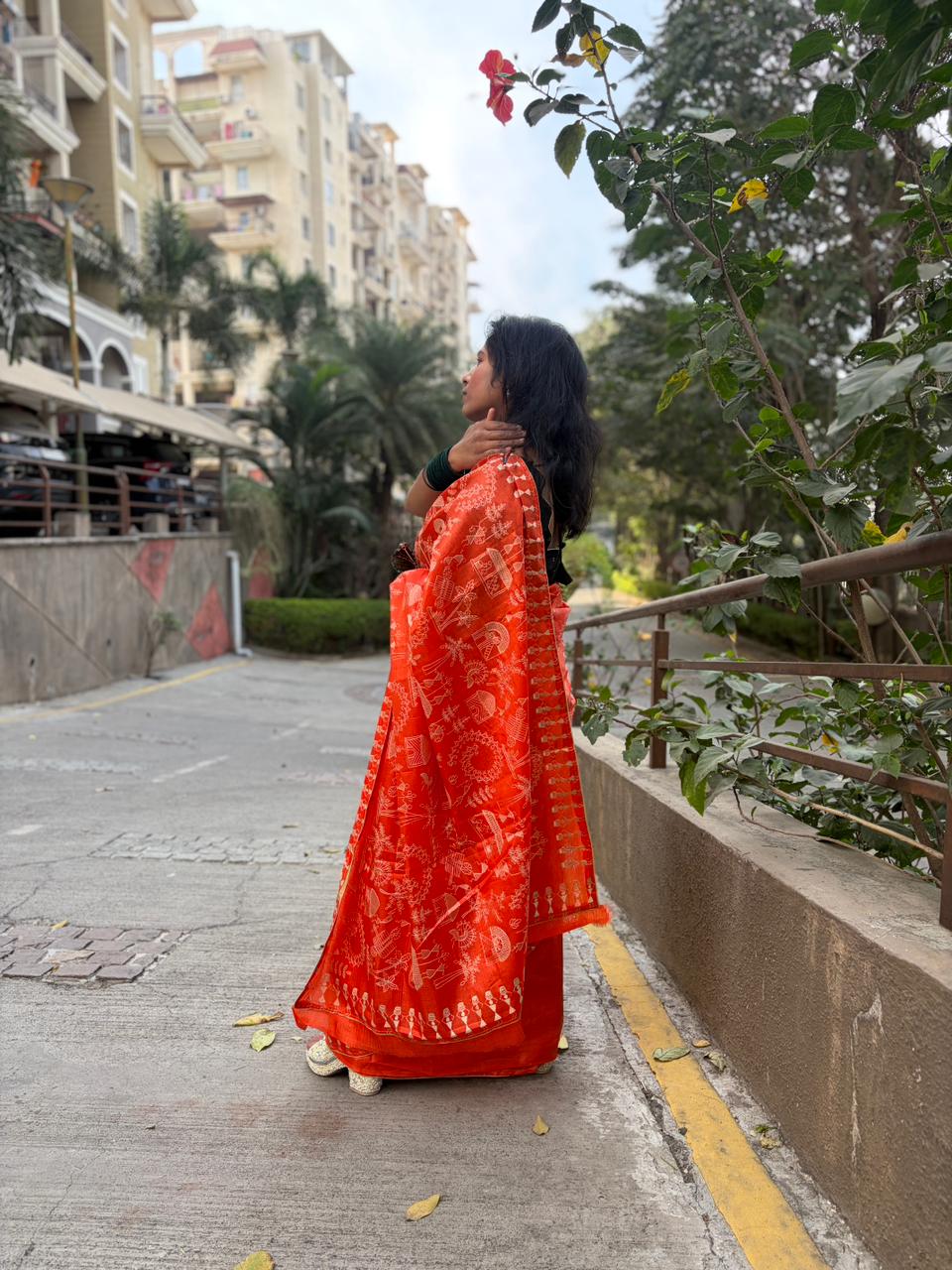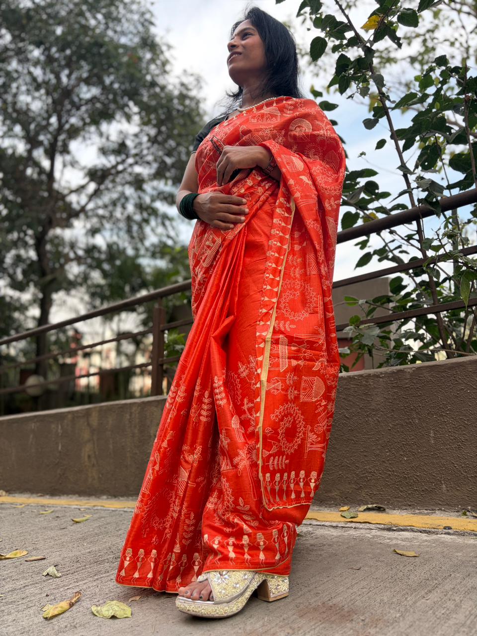A striking celebration of heritage and vibrancy, this Orange Mix Kosa Silk saree is adorned with all-over tribal-inspired embroidery that tells a story of culture, rhythm, and tradition. The rich orange base radiates warmth and confidence, while the delicate motifs—woven across the body and pallu—add character without overpowering the elegance of the silk.
