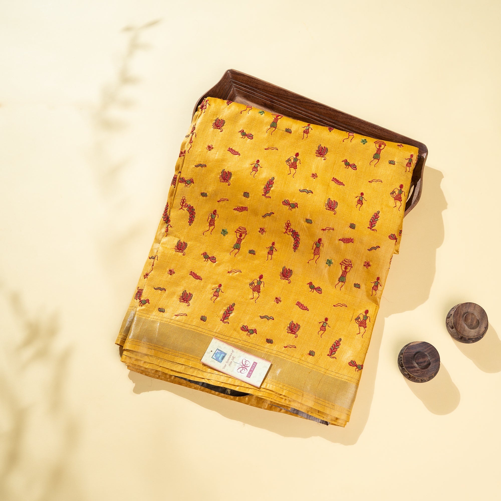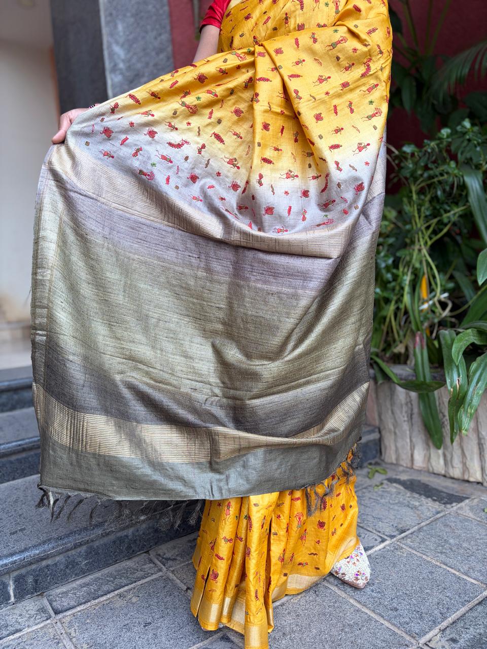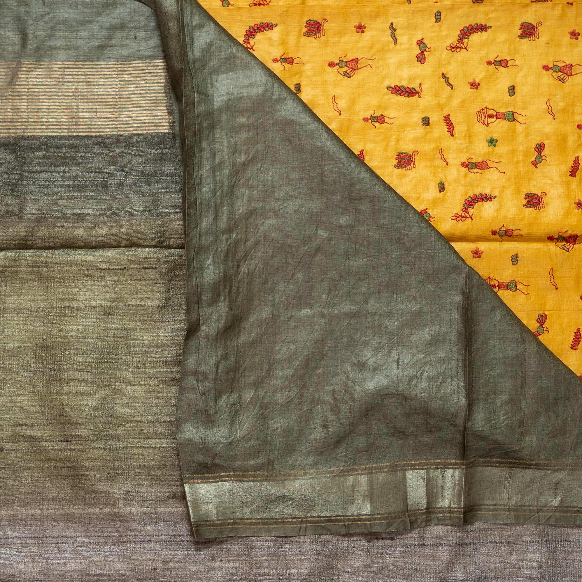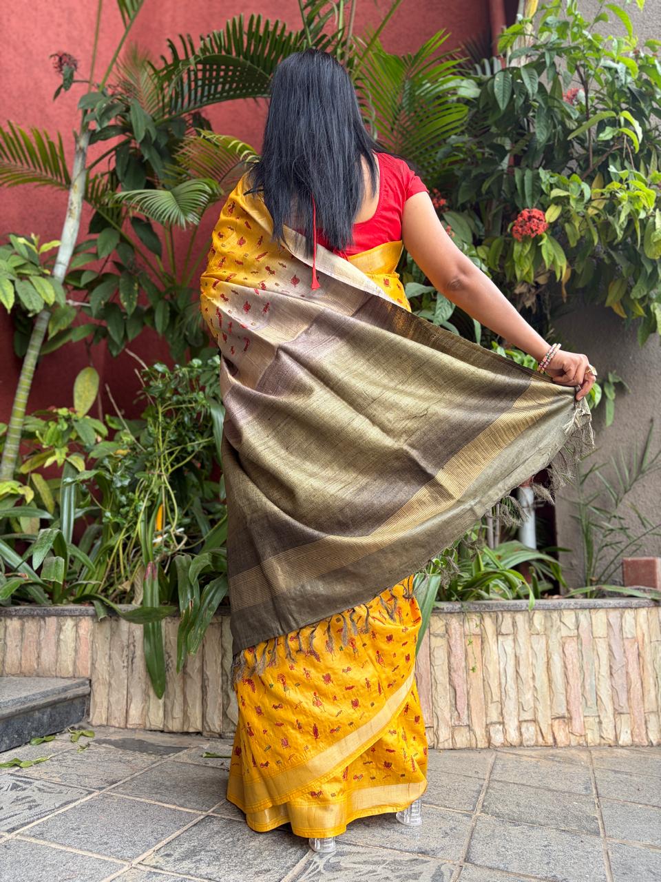 Mustard Yellow Pure Kosa Silk All Over Machine-Embroidery with Contrast Pallu & blouse (Silk Mark provided)