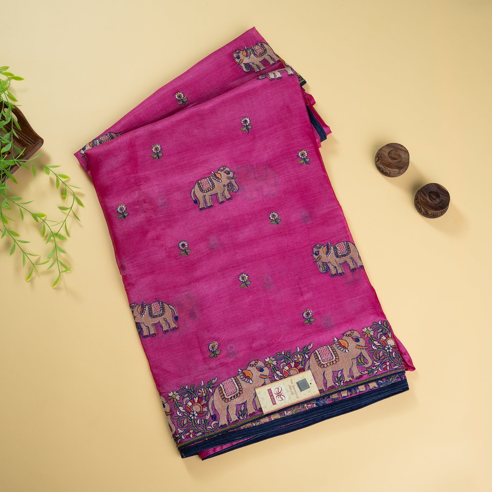 This Pure Kosa Silk saree in a rich magenta hue is a beautiful blend of traditional charm and refined detailing. Delicate machine-embroidered elephant motifs are scattered across the body, while the intricately embroidered border adds depth and visual richness. The natural texture and gentle sheen of authentic Kosa silk give the saree a graceful drape that feels light yet luxurious.