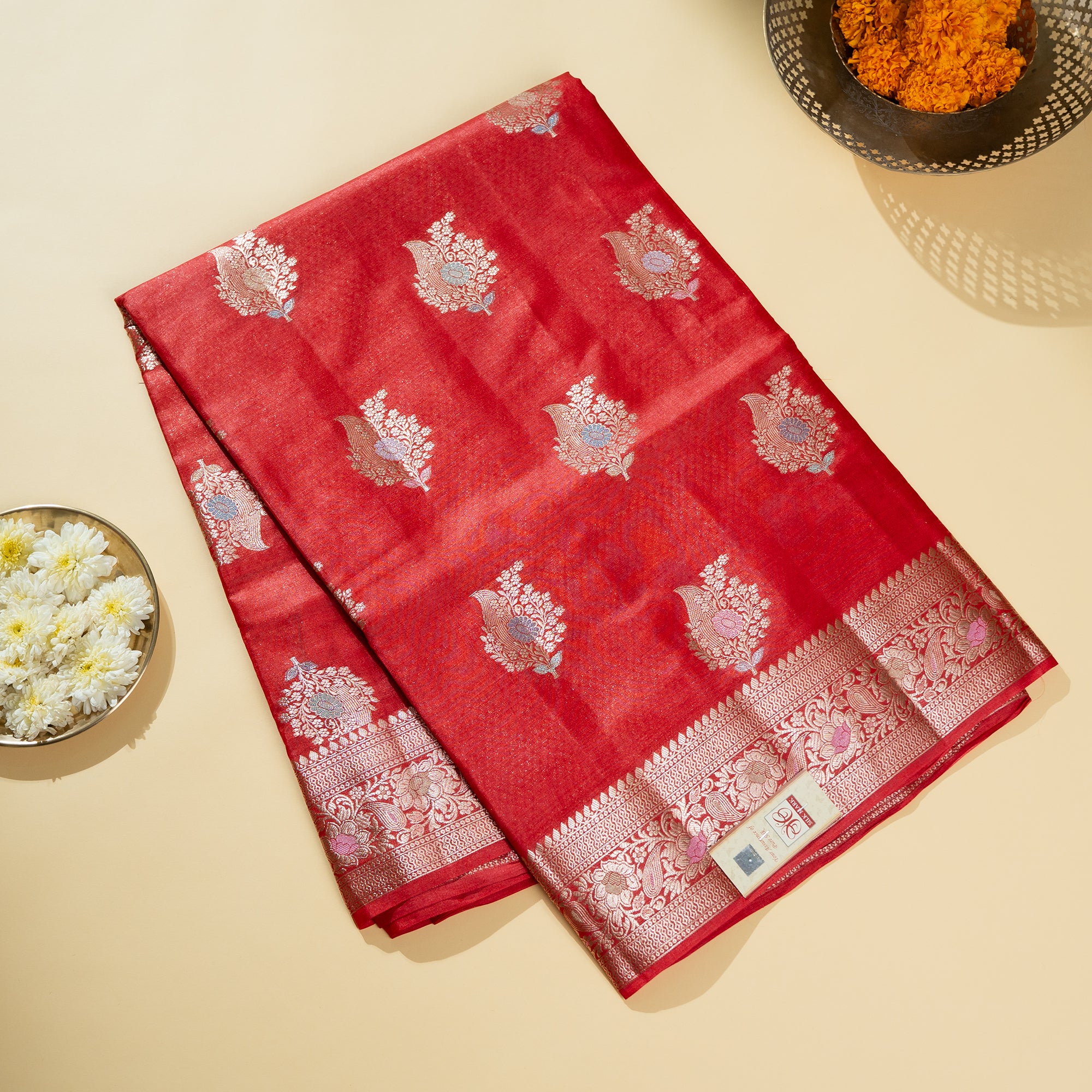 Wrap yourself in the quiet luxury of traditional craftsmanship with this stunning Red Kosa Silk Saree, woven to perfection for women who appreciate timeless elegance. The saree features a richly detailed all-over zari floral pattern paired with a beautifully crafted contrast red pallu and border, giving it a regal festive appeal.